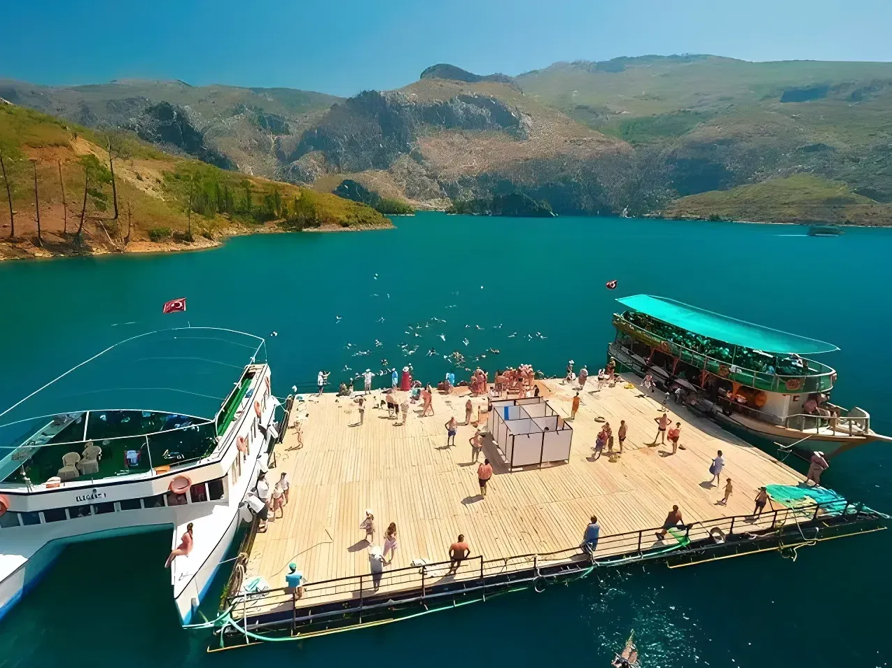 The Green Canyon boat tour takes place on the stunning Manavgat/Oymapınar Dam, the fourth-largest in Turkey and one of the few where boat trips are permitted. Your adventure begins with a hotel pick-up, followed by a scenic 1.5-hour drive through the Taurus Mountains and charming village landscapes, before reaching the breathtaking Oymapınar Dam.