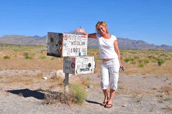 After a very tasty Alien Burger at the Little A'le' Inn, journey to the infamous Black Mailbox location (the mailbox was recently abducted), a sacred meeting place for UFO enthusiasts. Then arrive at the absolute perimeter of Area 51 through a strange and mutant Joshua Tree forest where the guards (The Men In Black) with their high-powered weapons, forever stand watch along with detection devices, listening devices, and cameras mounted among the cactus. Visitors can wave at the heavily armed guards in the 4x4 parked on the desert hillside, but they never wave back.