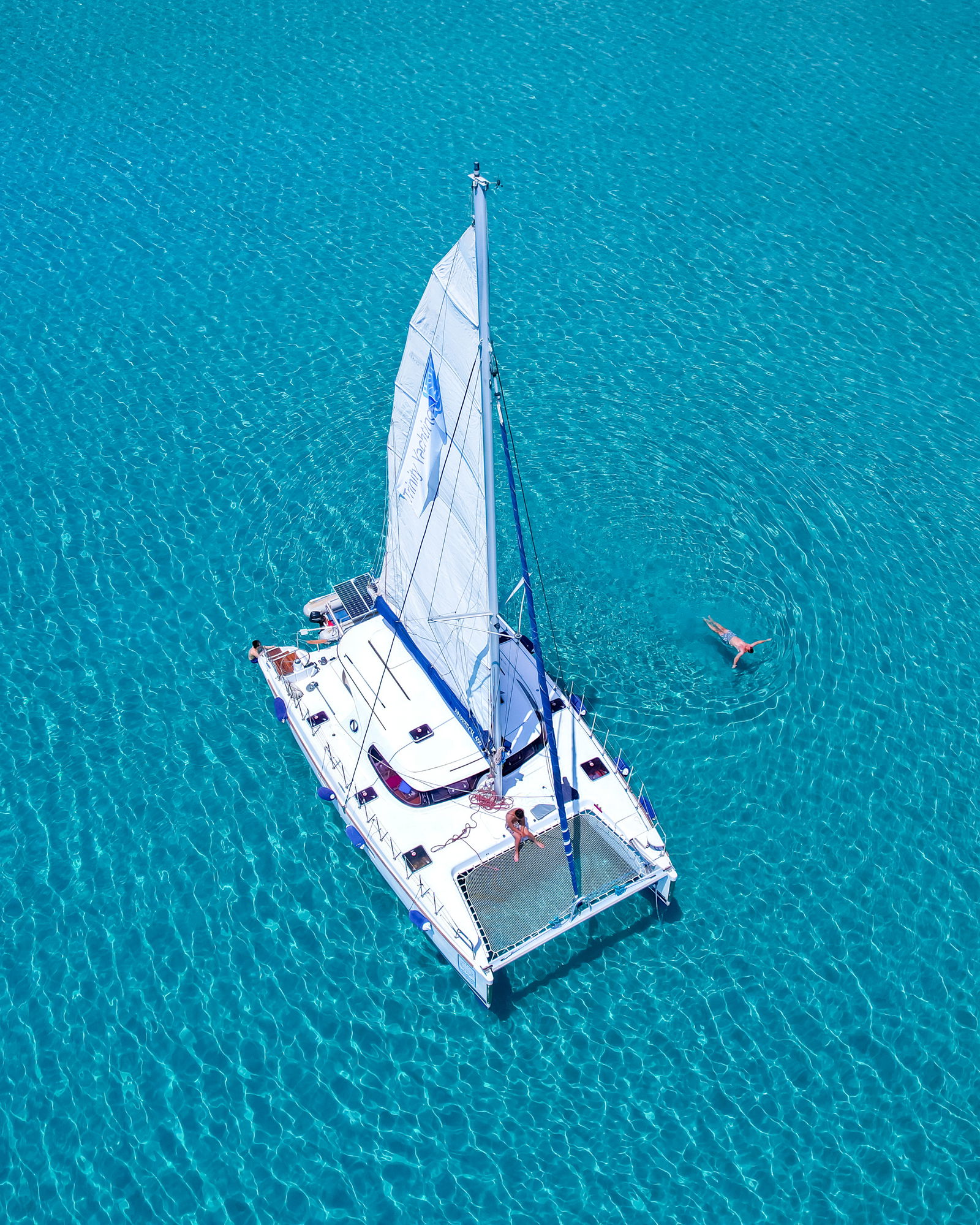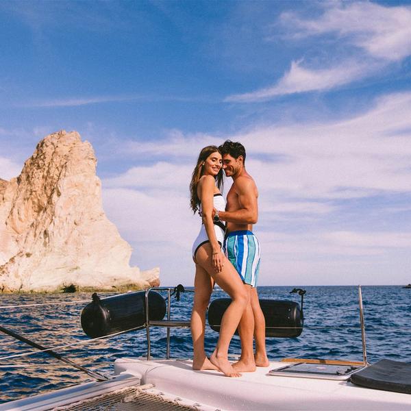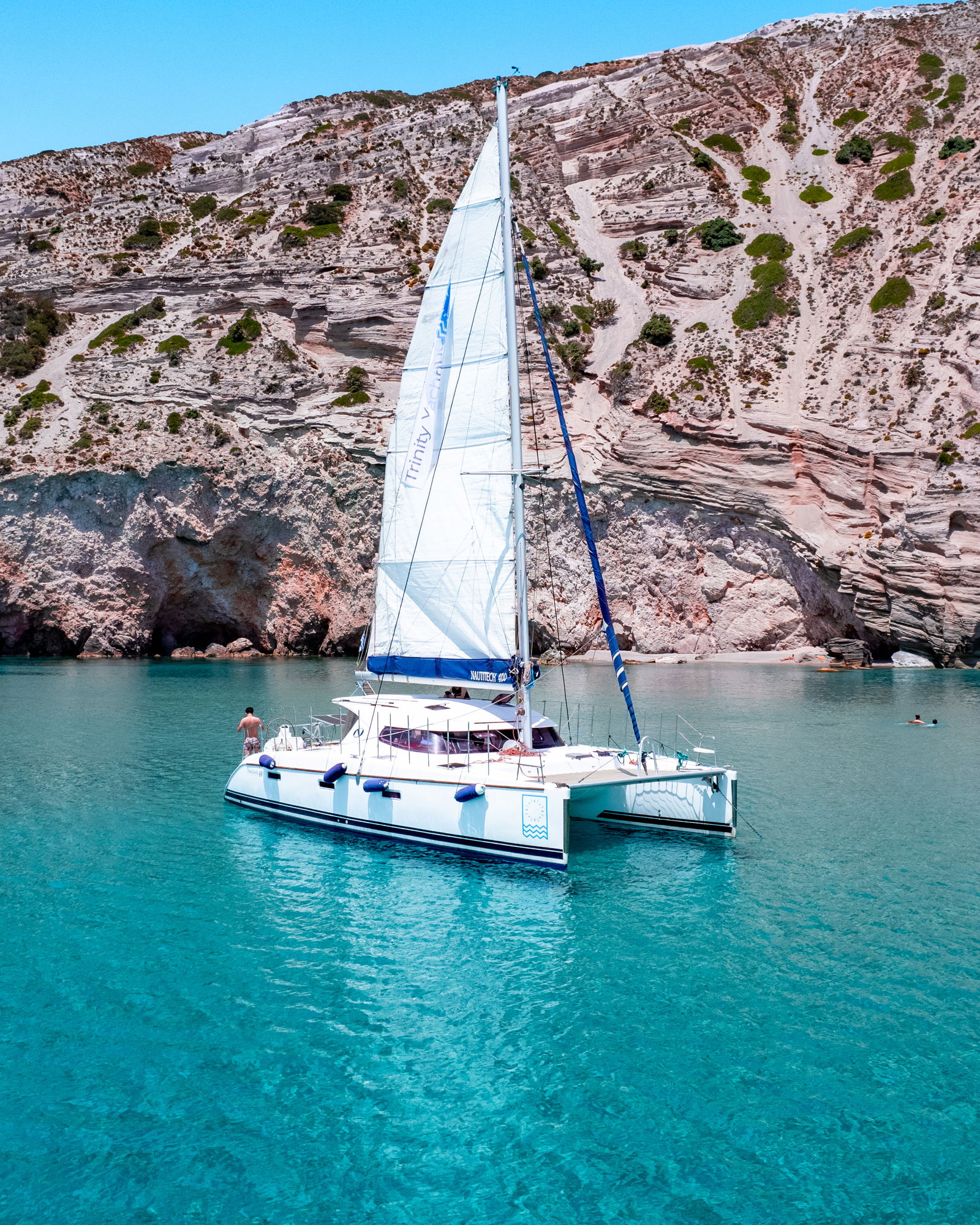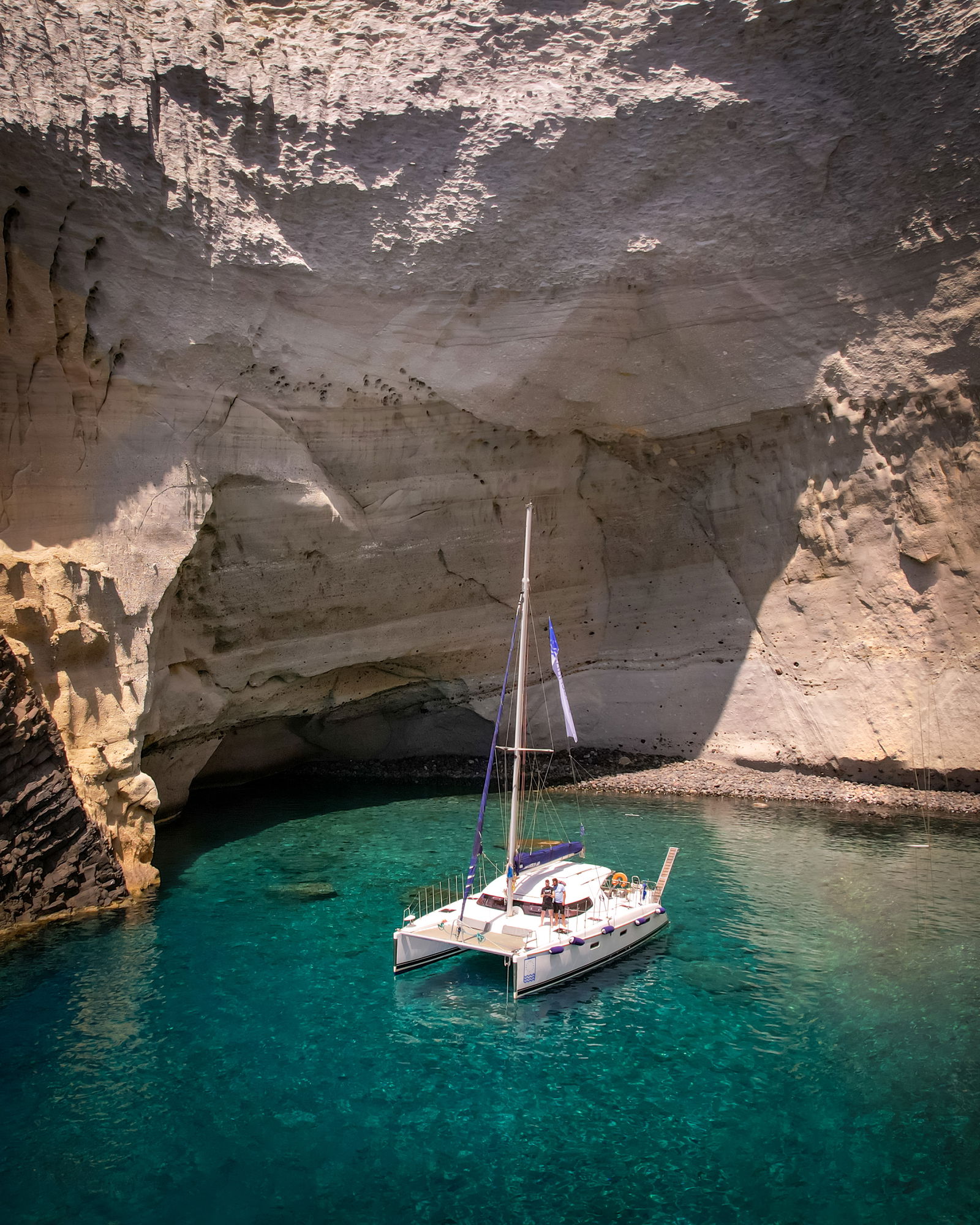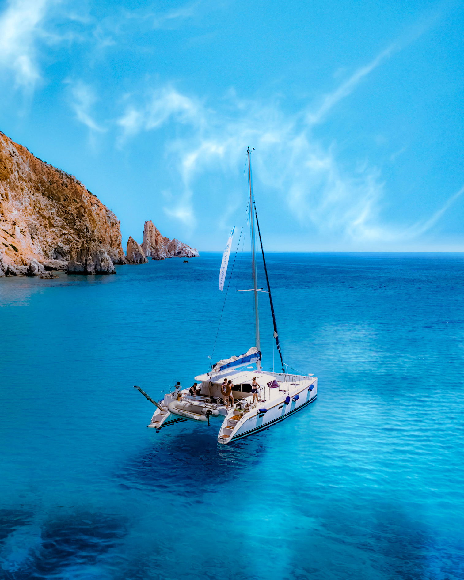 Sail with aboard a catamaran on a full-day tour around Milos and Poliegos Blue lagoon. Includes lunch, drinks, and snorkeling equipment!
