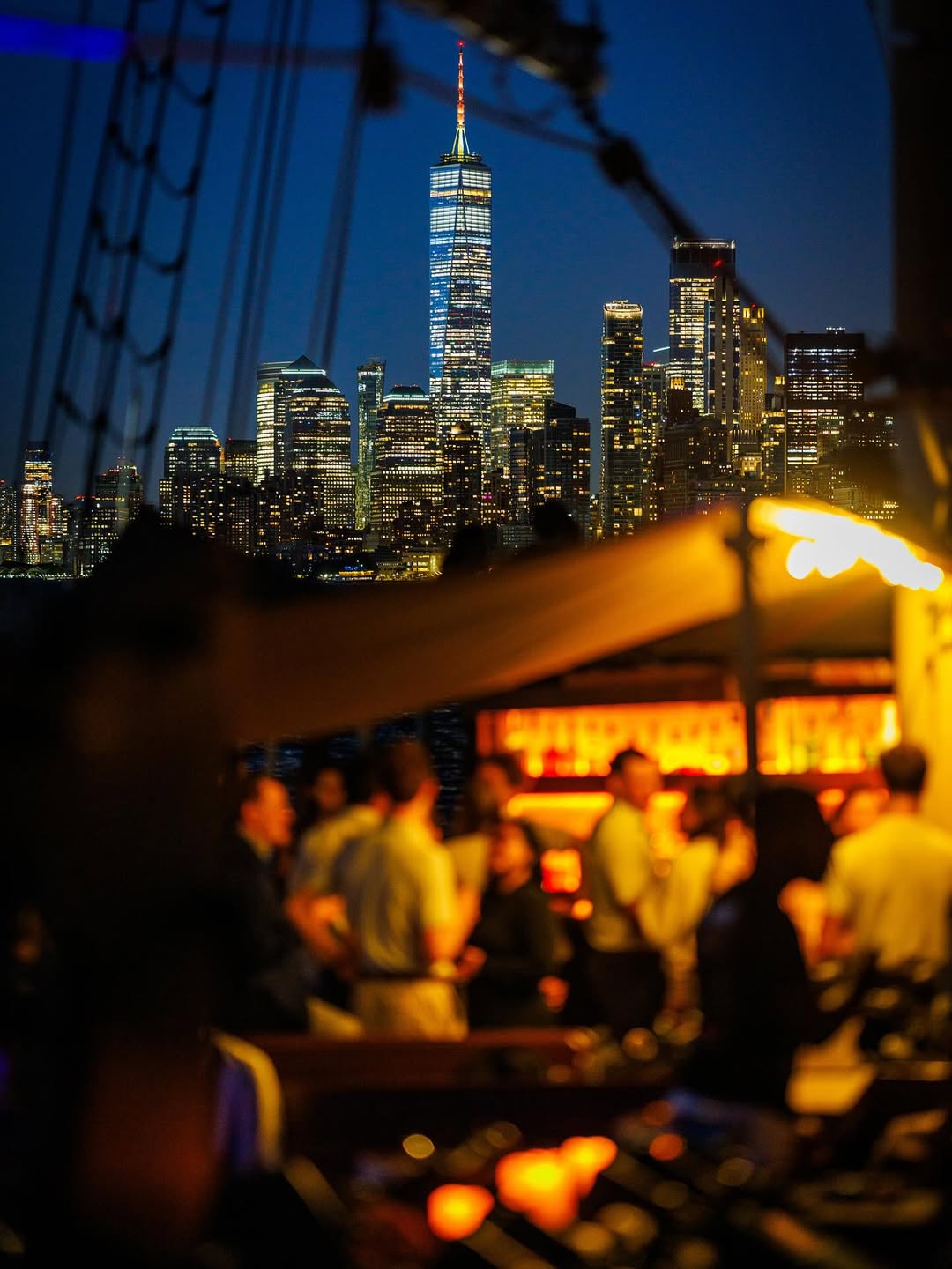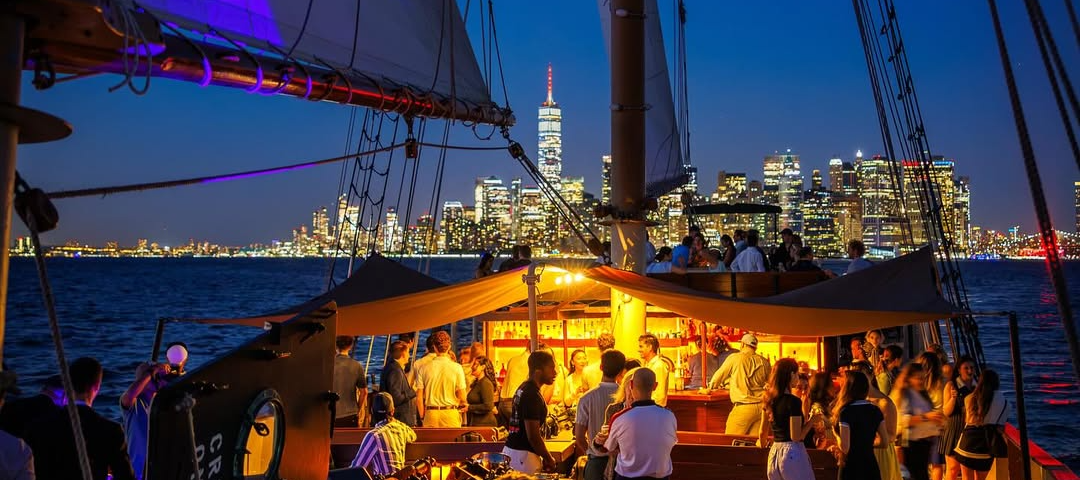 A shared boat cruise in the New York Harbor with beautiful views of the New York City skyline lit up at night.