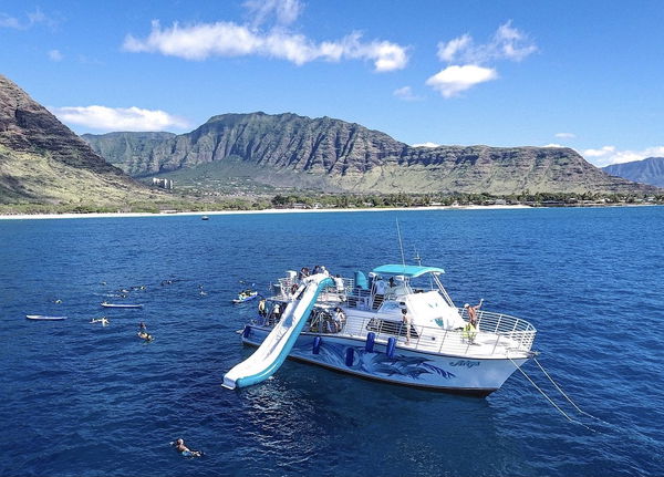 You will board a spacious 42-passenger catamaran boat to cruise the West Coast of O'ahu. This double-hulled catamaran features a comfortable and stable ride as you relax and take in the breathtaking views of the ocean and the mountains. In the clear waters of West O'ahu, enjoy this dolphin-watching and snorkeling experience with the wildlife and tropical island fishes.