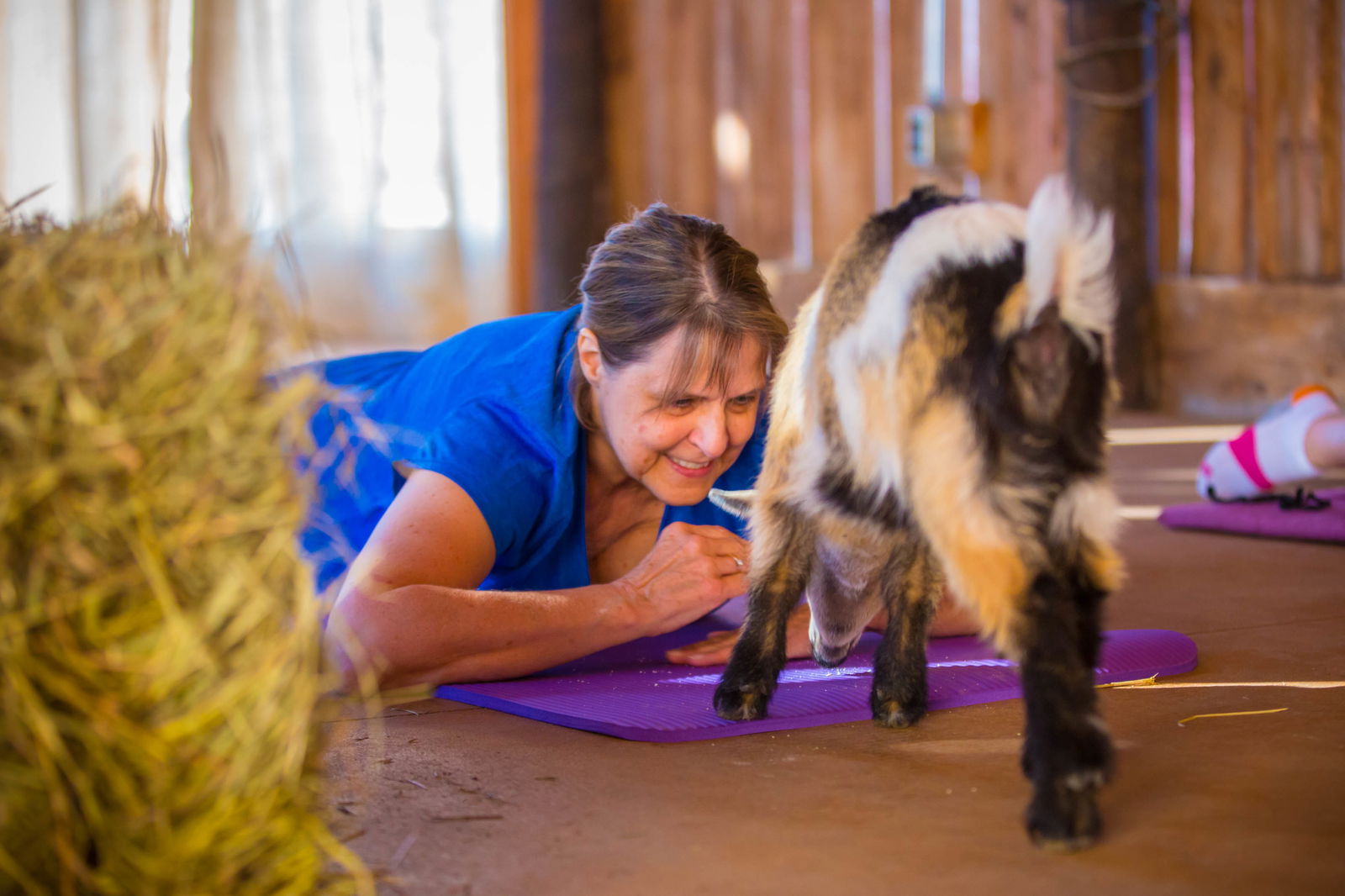 What is Goat Yoga? Well, it's just like regular yoga, with stretching, postures, and breathing, except with adorable and friendly goats wandering around, jumping on you as you "downward dog", trying to kiss your face and possibly nipping at your yoga pants. Goat yoga is part of a growing trend of including friendly animals in human exercise routines. It's healthy, it's therapeutic and it's loads of fun. NY Goat Yoga is NY's first-ever goat yoga business, bringing joy and wellness to the New York community since 2017!