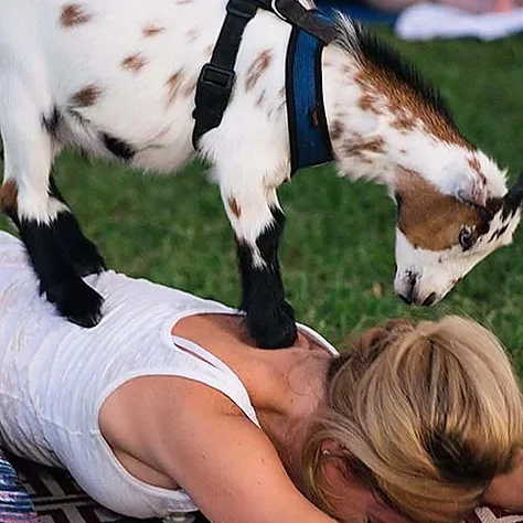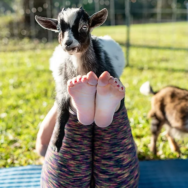 Goat Yoga is a fun interactive way to let loose and giggle while going through a yoga flow with cute cuddly goats hopping around!