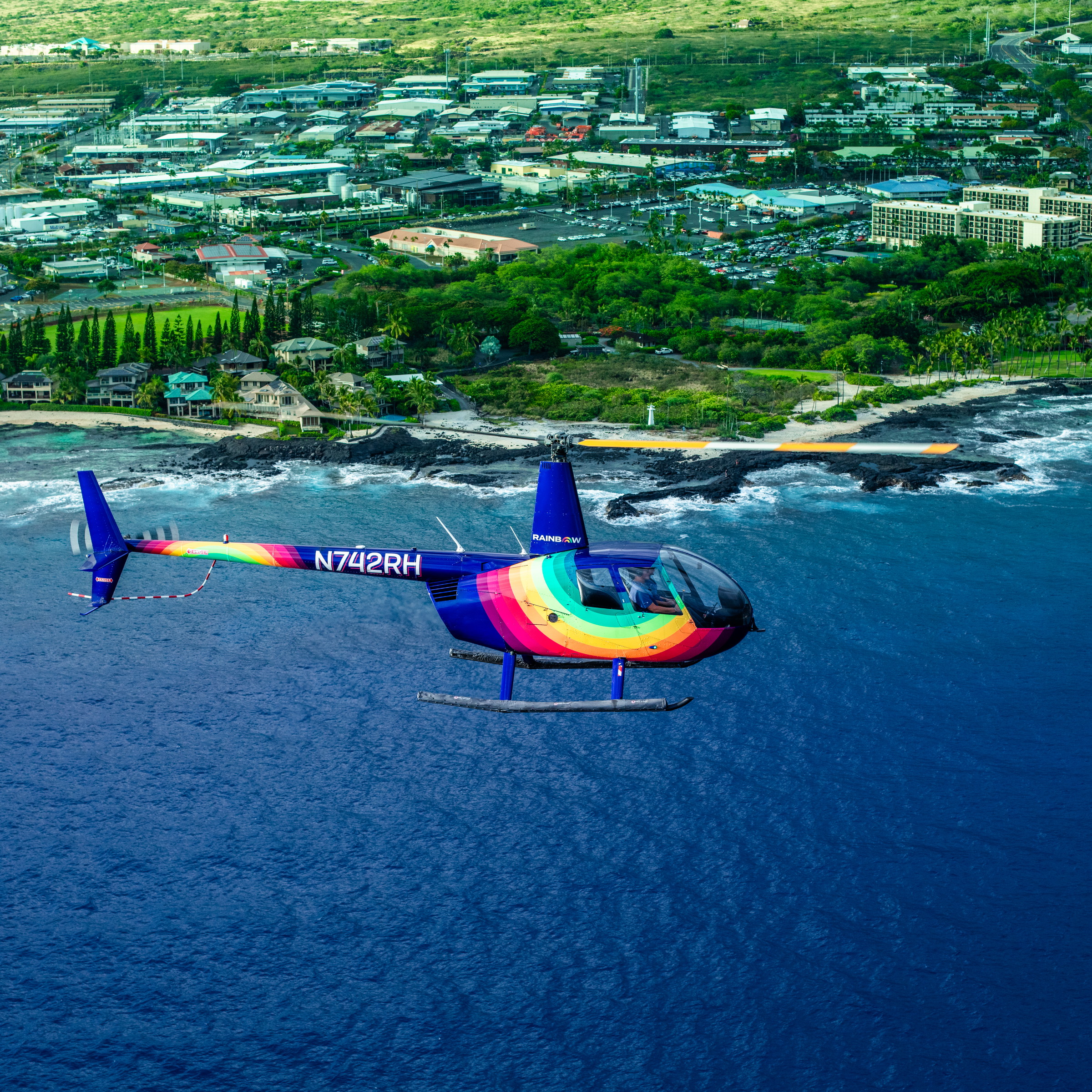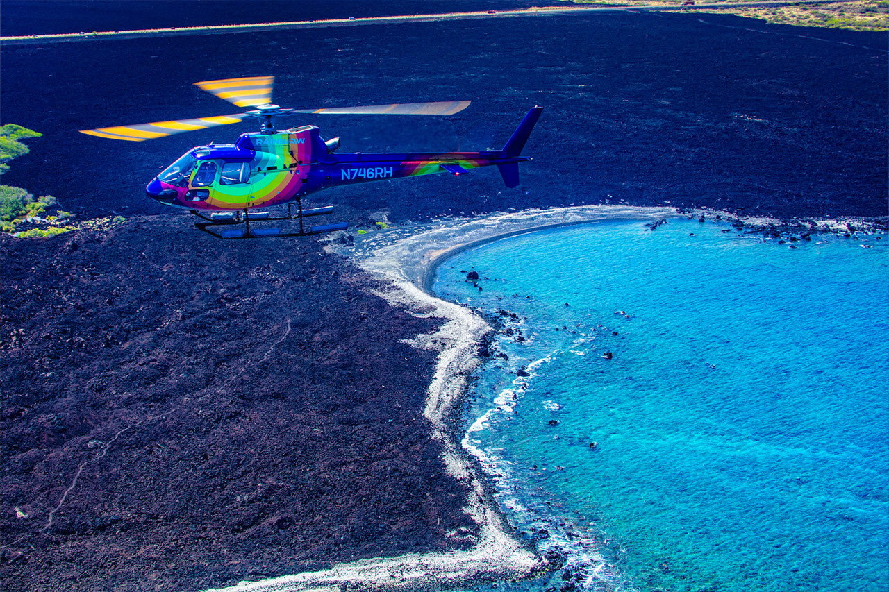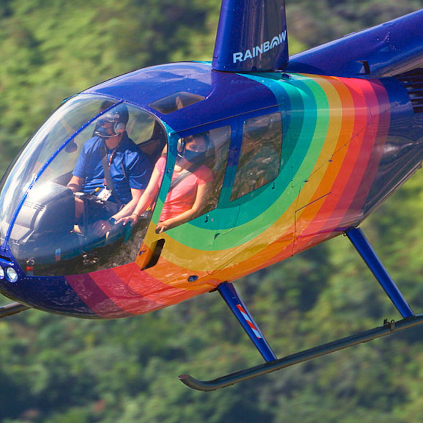 Fly over the Kilauea Volcano and experience the current state of the eruption – a story millions of years in the making! Believed to have formed 300,000–600,000 years ago as the Pacific tectonic plate moved over the Hawaiian hot spot, Kilauea is the youngest and most active of the five volcanoes on Hawaii's Big Island. Its summit, standing 4,091 feet above sea level, offers a breathtaking view of the island's volcanic landscape. As you take in the stark beauty of Kīlauea's volcanic landscape, including expansive lava fields and the dramatic sight of billowing volcanic gases rising into the air, you'll feel a profound connection to the planet's raw power. During periods of volcanic activity—Kīlauea has erupted over 30 times in the past 60 years—you may even witness molten lava flows adding to the island's ever-changing terrain. Soaring above this awe-inspiring spectacle, you can sense the presence of Pele, the Hawaiian goddess of fire and volcanoes, who is said to reside within this dynamic and sacred force of nature. This tour can be enjoyed with doors on or off at not extra cost.