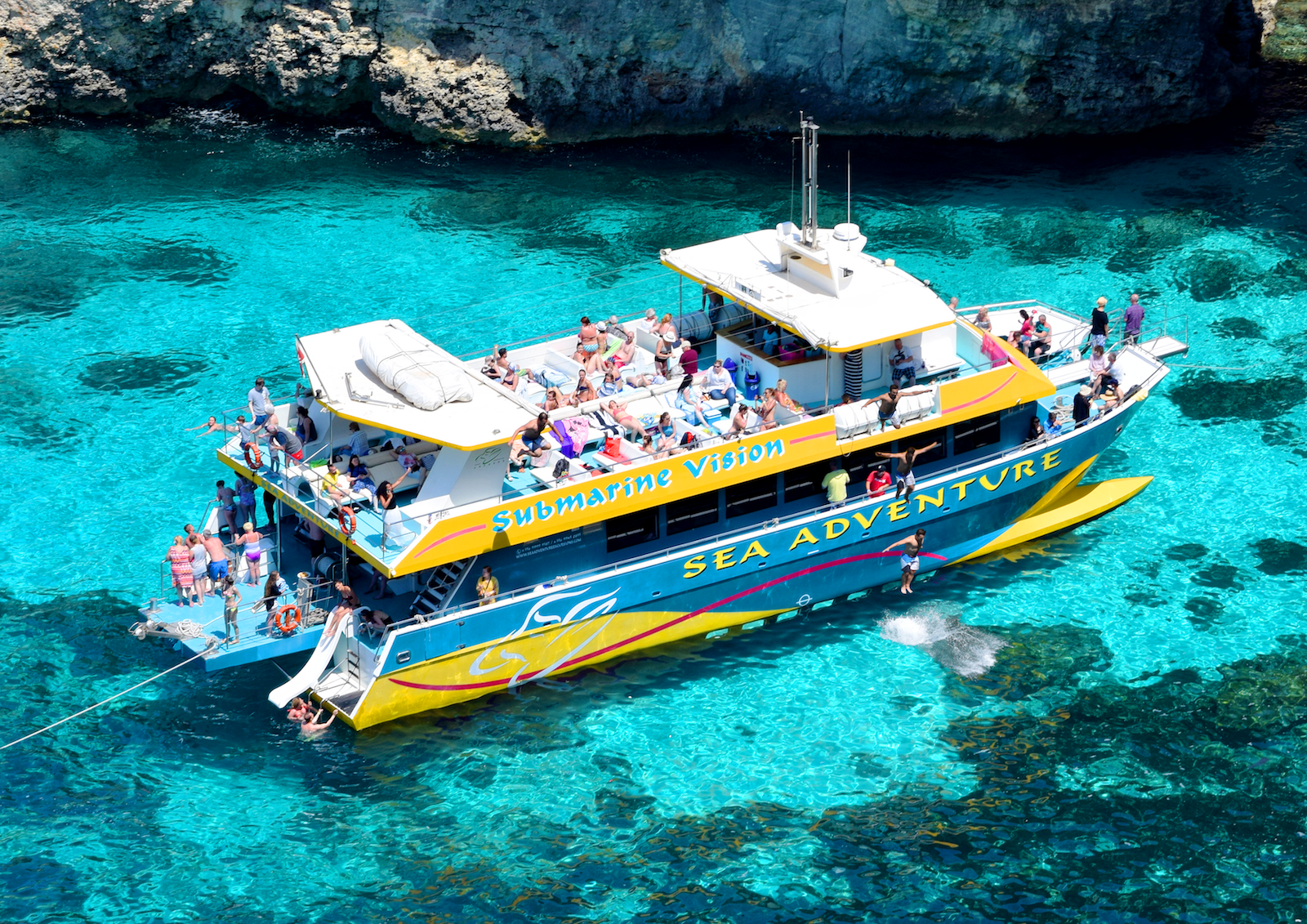 Surrounded by steep cliffs and only accessible by boat, this is a real local treat that not many people get to see. You'll also spot a hidden shipwreck, which you can admire from one of 26 underwater windows, before arriving at the Blue Lagoon itself. Moor in a prime spot, and use the boat as a base for the rest of the day.