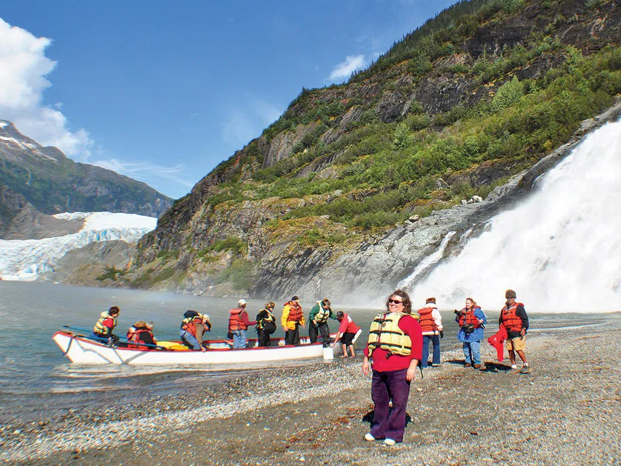 As you venture closer, you'll paddle within a safe distance of the glacier's massive, ever-changing face. Then, experience the power of Nugget Falls as you skirt its thundering base for an exhilarating close-up view. Midway through your journey, you'll come ashore for a snack of Alaskan-style fare, a chance to rest, and time to absorb the breathtaking surroundings before paddling back across the lake.