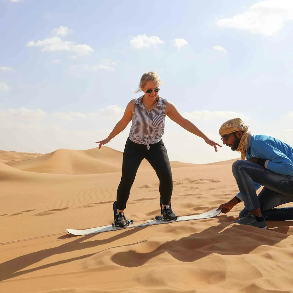Enjoy the magical atmosphere of the desert in the morning. Includes sand boarding, dune bashing, and a camel ride.