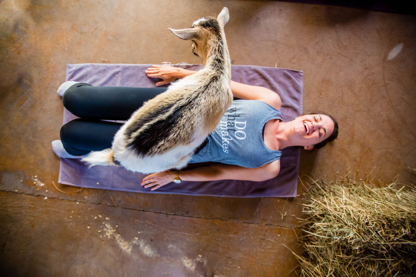 What is Goat Yoga? Well, it's just like regular yoga, with stretching, postures, and breathing, except with adorable and friendly goats wandering around, jumping on you as you "downward dog", trying to kiss your face and possibly nipping at your yoga pants. Goat yoga is part of a growing trend of including friendly animals in human exercise routines. It's healthy, it's therapeutic and it's loads of fun. The yoga will be designed for beginners and experienced yogis. NY Goat Yoga is NY's first-ever goat yoga business, bringing joy and wellness to the New York community since 2017!