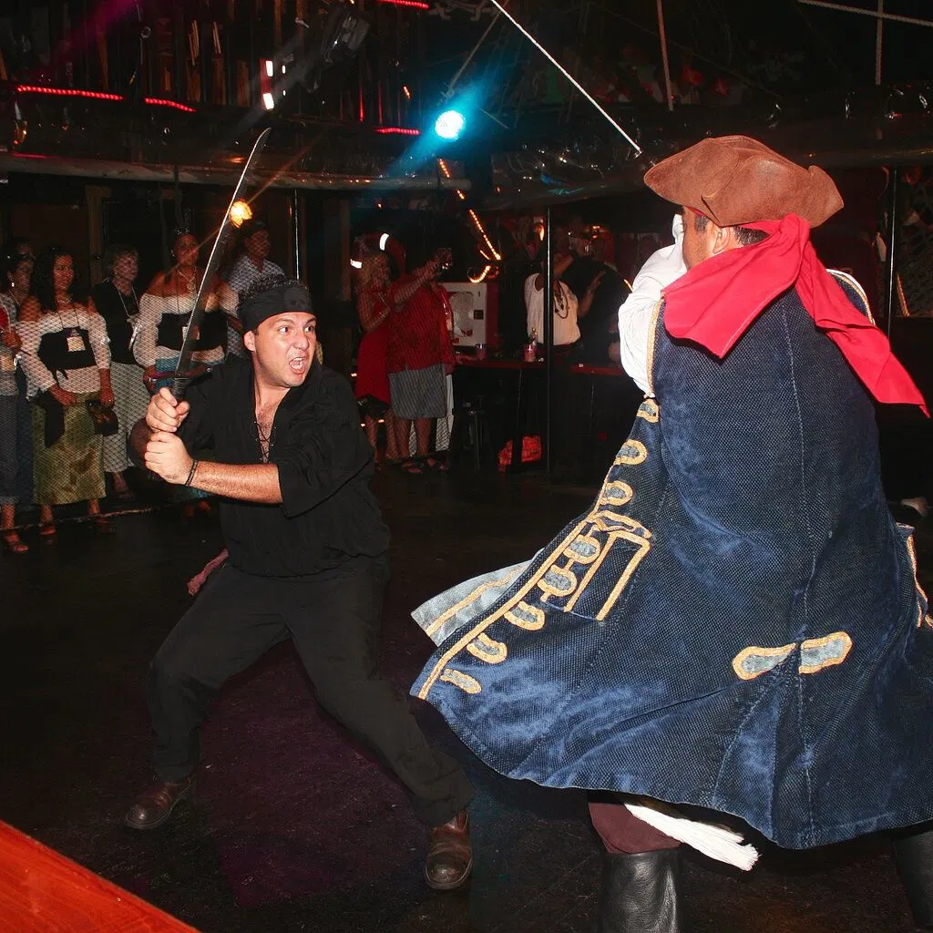 Then, enjoy a spectacular battle between pirates in the Caribbean Sea, where you will see shining swords in acrobatic flights, sliding down between ropes, shelling with cannons and exploding powderkegs, which will make you feel part of this bold show.
