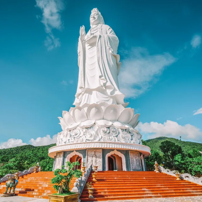 Start your adventure at the Marble Mountains, an impressive collection of five limestone outcrops rising 500 meters high. Explore craggy caves and hidden tunnels filled with temples and shrines—an ideal spot for adventure-seekers. Then, visit Linh Ung Pagoda, home to the giant Lady Buddha statue, standing 67 meters tall. You'll explore this serene temple by the ocean and learn more about Buddhism in Vietnam. Also explore the Cham Museum, featuring statues and artifacts from the ancient Cham civilization dating back to the 3rd century. After a busy day of exploring, you can relax at My Khe Beach, with its white sand, clear water, and blue skies, making it the perfect spot to unwind before heading home.