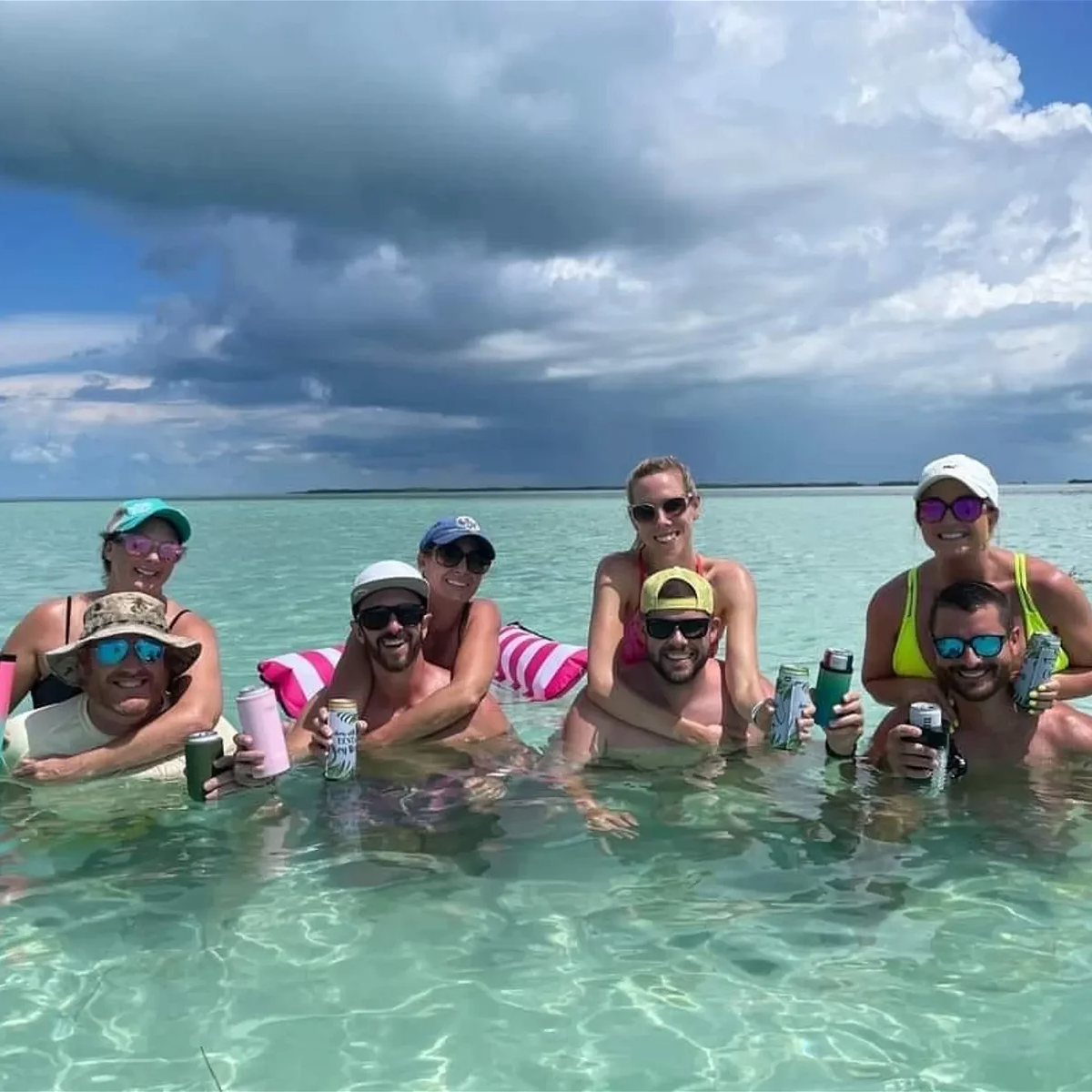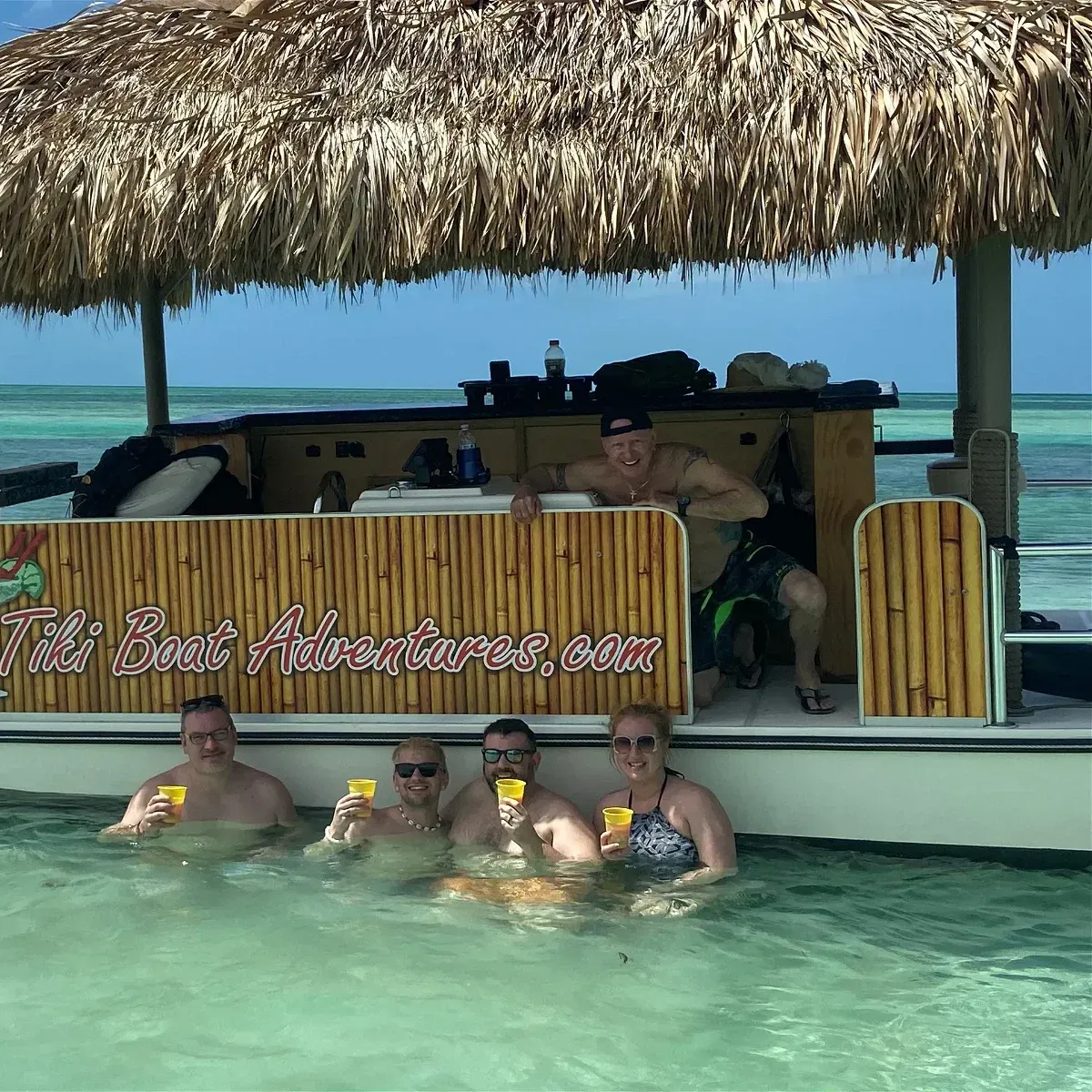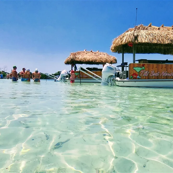 Your bar stool is waiting on a two-hour sandbar trip on a private tiki boat.