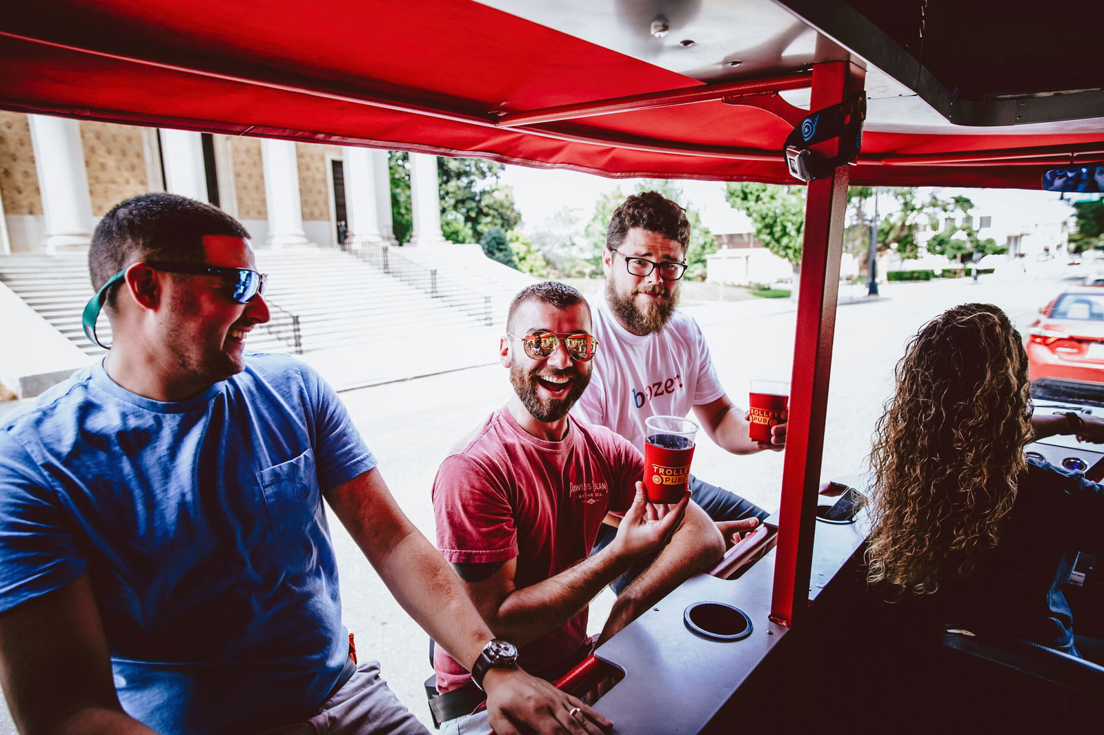 Trolley Pub is a pedal-powered, eco-friendly, pub-crawling trolley for up to 15 people at a time. The Trolley Pub is powered by YOU and your fellow pedalers, with an electric assist motor for the hills. It's hard not to smile on the Trolley Pub!