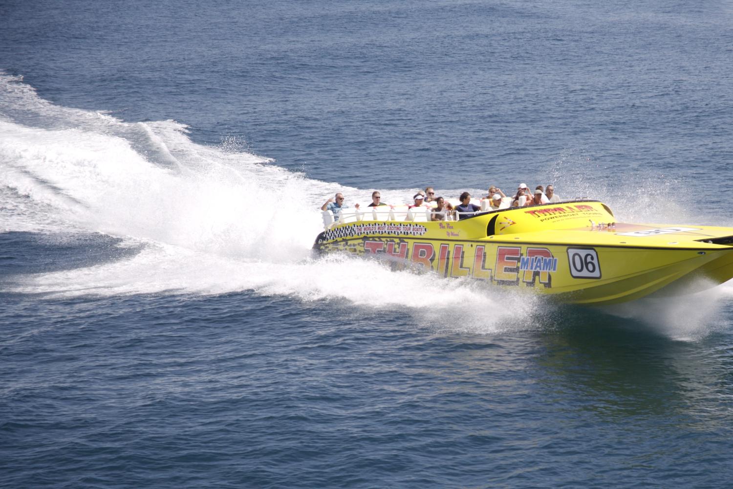 Get ready for an unforgettable adventure on the Thriller Speedboat Tour, Miami's most exciting sightseeing experience. Departing from Bayside Marketplace in Downtown Miami, this high-speed ride takes you across Biscayne Bay in full Miami Vice style. Glide past the luxurious celebrity homes of Star Island and Fisher Island, then zoom into the Atlantic Ocean for a unique offshore view of Miami Beach and the world-famous Art Deco district of South Beach.