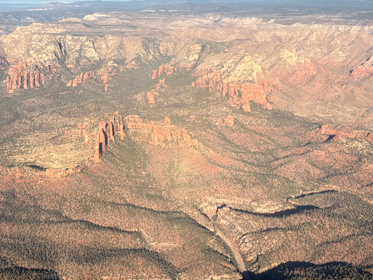 This tour takes off from Cottonwood Airport, offering breathtaking views of the Verde Valley and passing Jerome as you head into Sycamore Canyon. Known as the "miniature Grand Canyon of Northern Arizona," the Sycamore flyover is a highlight. As you exit Sycamore Canyon towards the East, you'll catch sight of Loy Butte, Red Canyon, and Bear Mountain. Look out to the left to glimpse Boynton Canyon before turning back to Cottonwood, flying over the beautiful Verde Valley.