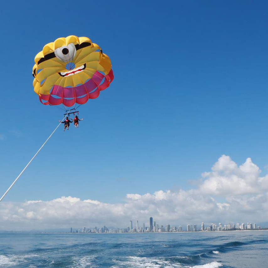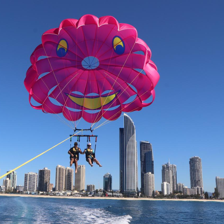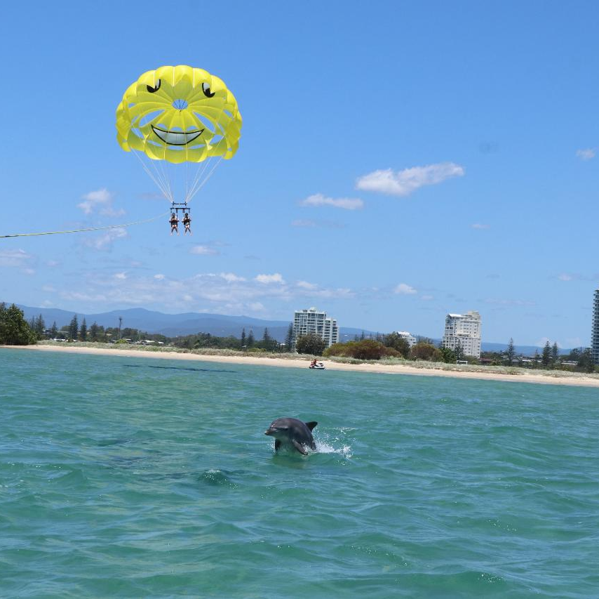 Imagine yourself flying 400ft high above the Gold Coasts broad water, seeing the skyline of Surfers paradise to as far as Brisbane. You will be harnessed up in the latest safety equipment and winched up high above our purpose built Parasailing boat for around 8 minutes fly time. This is a experience not to be missed! Then embark on a unique, exhilarating ride through Gold Coast's outstanding Broadwater. Departing from The Exclusive Marina Mirage Super Yacht Marina, we soon hit speeds of up to 80 kph. Speed aside, this ride also includes 360 degree spins, high speed slides, beach buzzing, fish tailing and heart stopping fun.