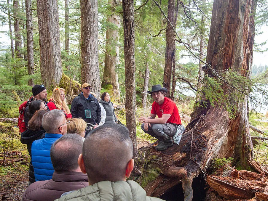 Upon reaching shore, your guide will lead you to a wilderness camp, where a delicious Alaskan snack awaits. Afterward, join your guide on an optional nature walk through the old-growth forest, where you'll learn about the unique flora and fauna of the temperate rainforest.