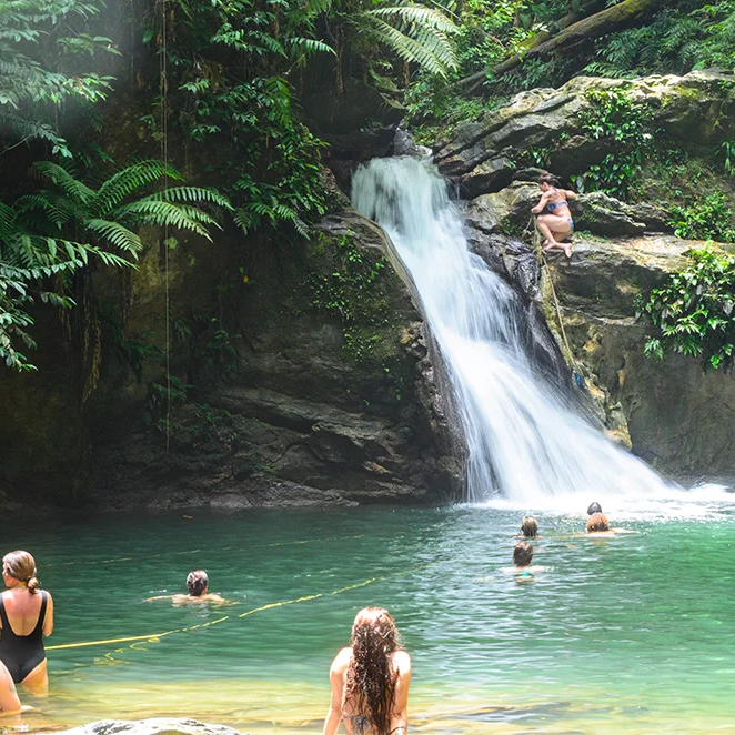 Your trailhead is in a tiny village in the middle of the rainforest. Hike for about an hour, along a flat riverbed, before you arrive at the 100-foot (30-m) waterfall. You can swim in the large pool around the falls, even take a "shower" under the falls. On the return trip you get a chance to make stops at Las Cuevas or Maracas Beach.