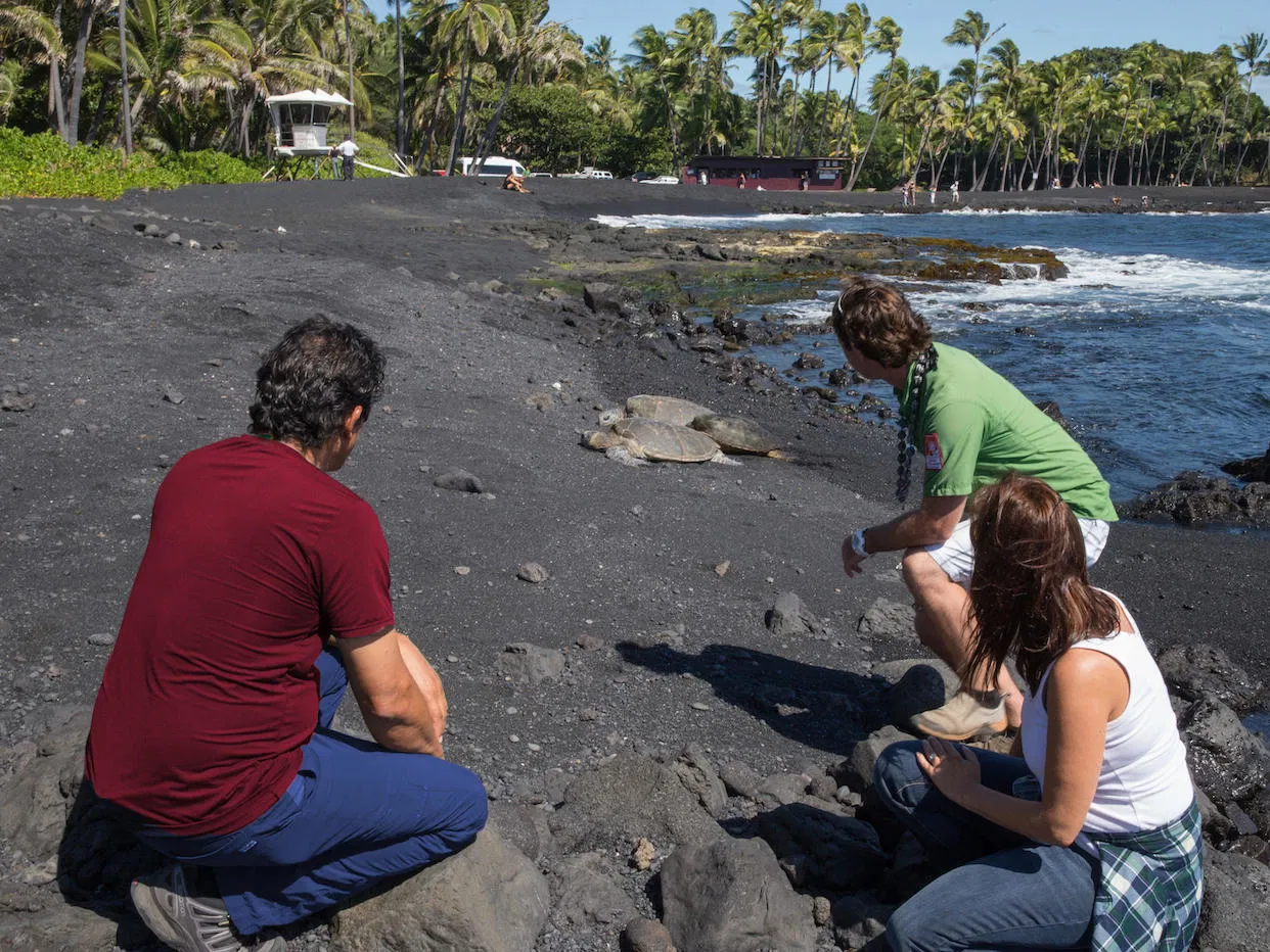 Indulge in local treats at Punalu’u Bake Shop, known as the southernmost bakery in the USA, before relaxing on Punalu’u Black Sand Beach, where you might spot green sea turtles along the shoreline.