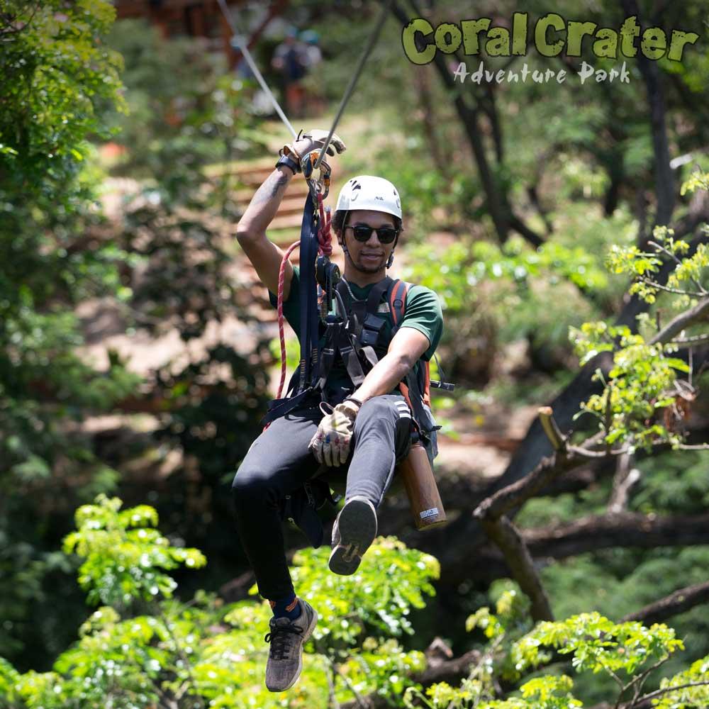 Most adventurers want to do it all, and with the Ultimate Adventure package, you can! If you can't decide between the other packages, why not go all in? Some of the most exciting new Oahu activities can be found at Coral Crater, and this is your chance to experience them all. Enjoy all six ziplines, off-road in a side-by-side ATV, experience the king swing, freefall, and a state-of-the art Adventure Tower. This package will satisfy those who are thirsty for adventure and looking to spend their day participating in exciting new experiences. Professionally-trained guides will accompany you throughout the day and make sure you're having maximum fun and staying safe! Since you'll be participating in all of the activities offered at Coral Crater Adventure Park, there's a pretty good chance of getting a little dirty, so come dressed for adventure! Wear comfortable clothing and closed-toe shoes so you can enjoy each element of this tour. Leave your favorite shirt at home!