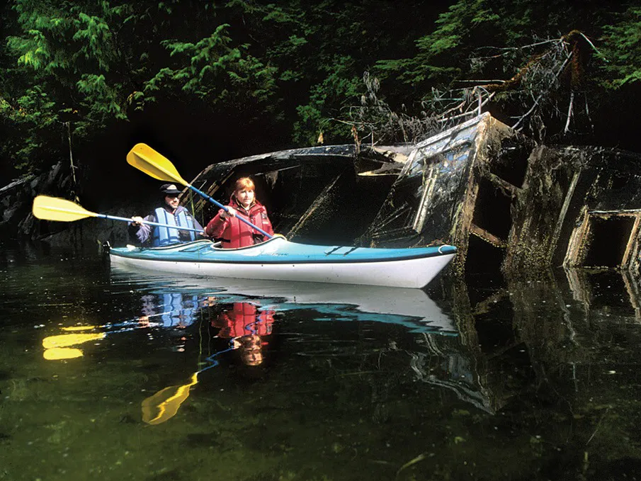 At a floating base camp, your guide will provide paddling tips and essential gear, including raingear, boots, and a life vest. Then, hop into a two-person kayak and glide through the calm, sheltered waters of Camp Coogan Bay.