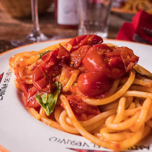 Following this, the main course will be served: typical spaghetti with tomatoes from Piennolo and basil sauce. And finally, this gastronomic experience comes with the traditional Neapolitan dessert "Pastiera" made with ricotta cheese, wheat, and candied fruit. Everything will be accompanied by Lacryma Christi wines.
